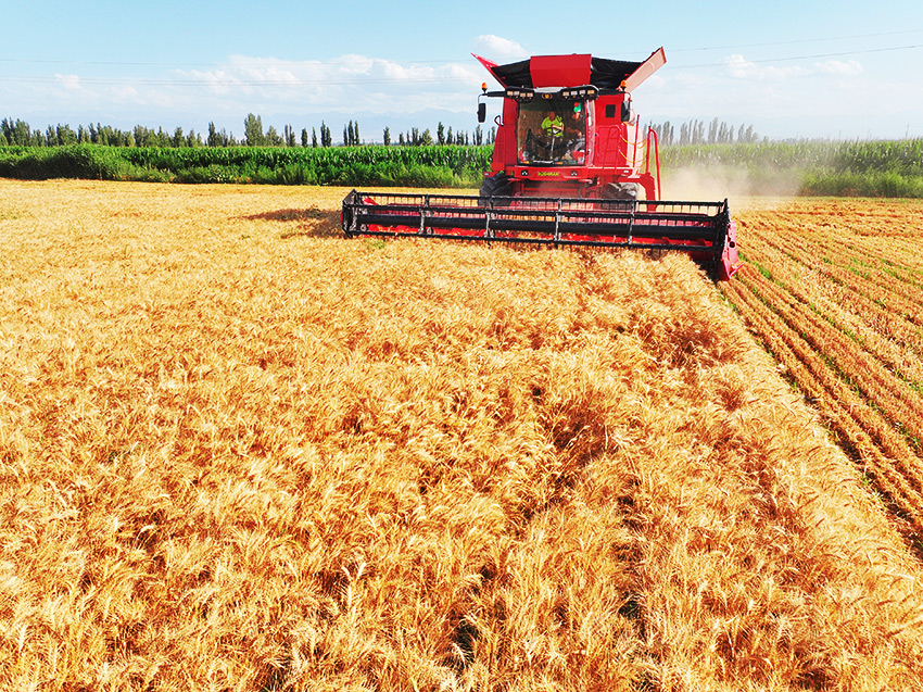 钵施然自主研发的7850谷物收割机,高效多能、喂入量大。